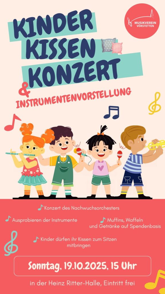 Das Nachwuchsorchester präsentiert ein fröhliches Konzert, bei dem Kinder eingeladen sind, es sich mit ihrem eigenen Kissen gemütlich zu machen. Im Anschluss können die kleinen Besucher verschiedene Instrumente selbst ausprobieren und in die Welt der Musik eintauchen. Für das leibliche Wohl ist mit Muffins, Waffeln und Getränken auf Spendenbasis gesorgt.